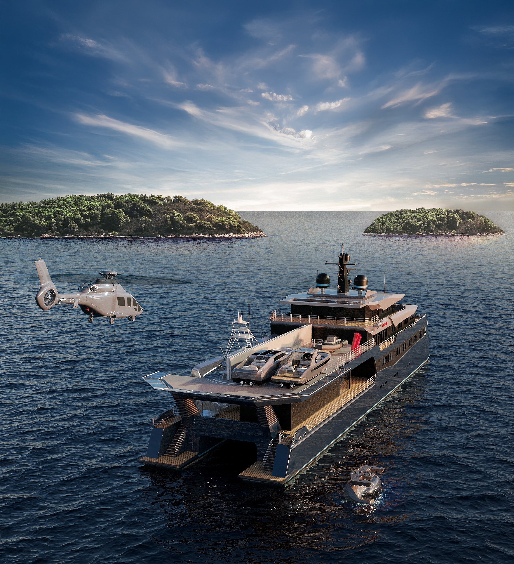 High capability, bespoke support vessels designed to carry aviation, logistics and expedition systems, enabling the primary yacht to remain uncompromised.