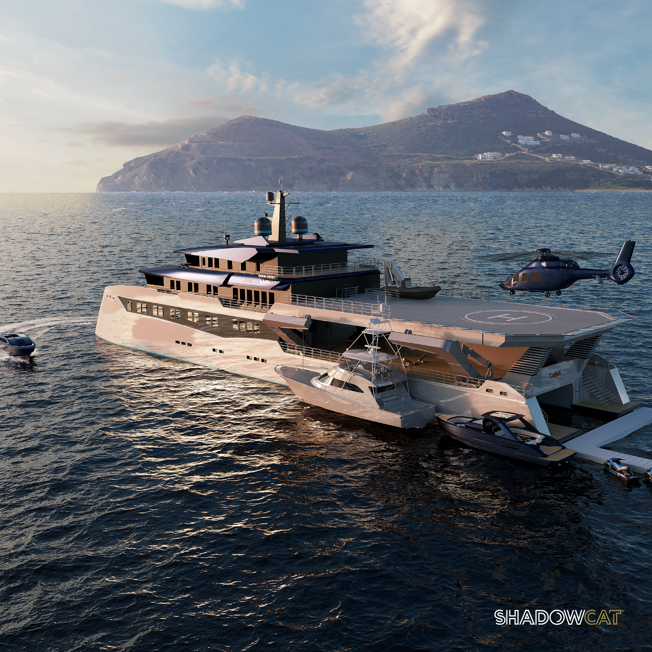 Shadowcat, the award-winning developer of catamaran-based superyacht support vessels, introduces its latest concept vessel—a true expedition marvel engineered for the most demanding maritime adventures. The first-of-its kind vessel combines luxurious accommodations with unparalleled versatility, offering the ability to carry and deploy a custom 61-foot sportfish, three large bespoke Pascoe International tenders, the AVA 660/7 (a 7 -person Triton submersible), and an EC135 helicopter from its certified pad and hangar, along with generous and elegant accommodation for 10 guests and 19 crew.
