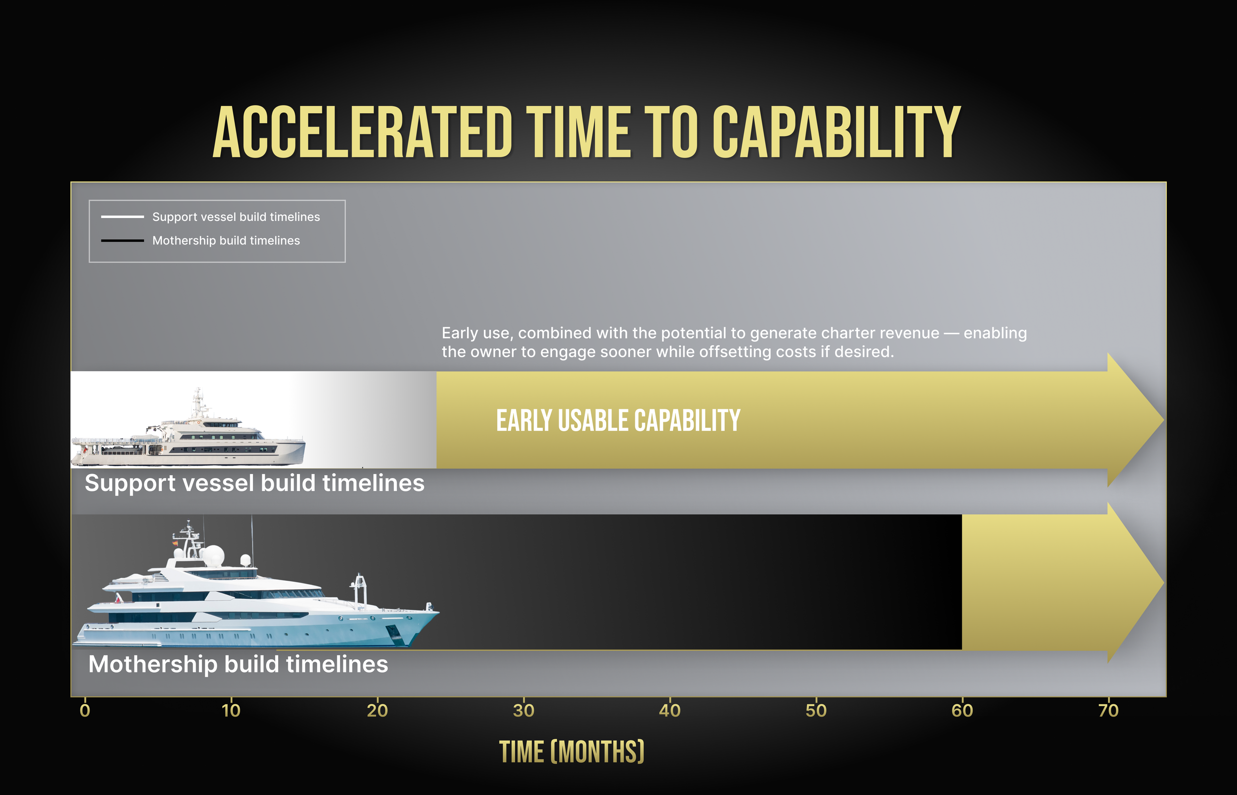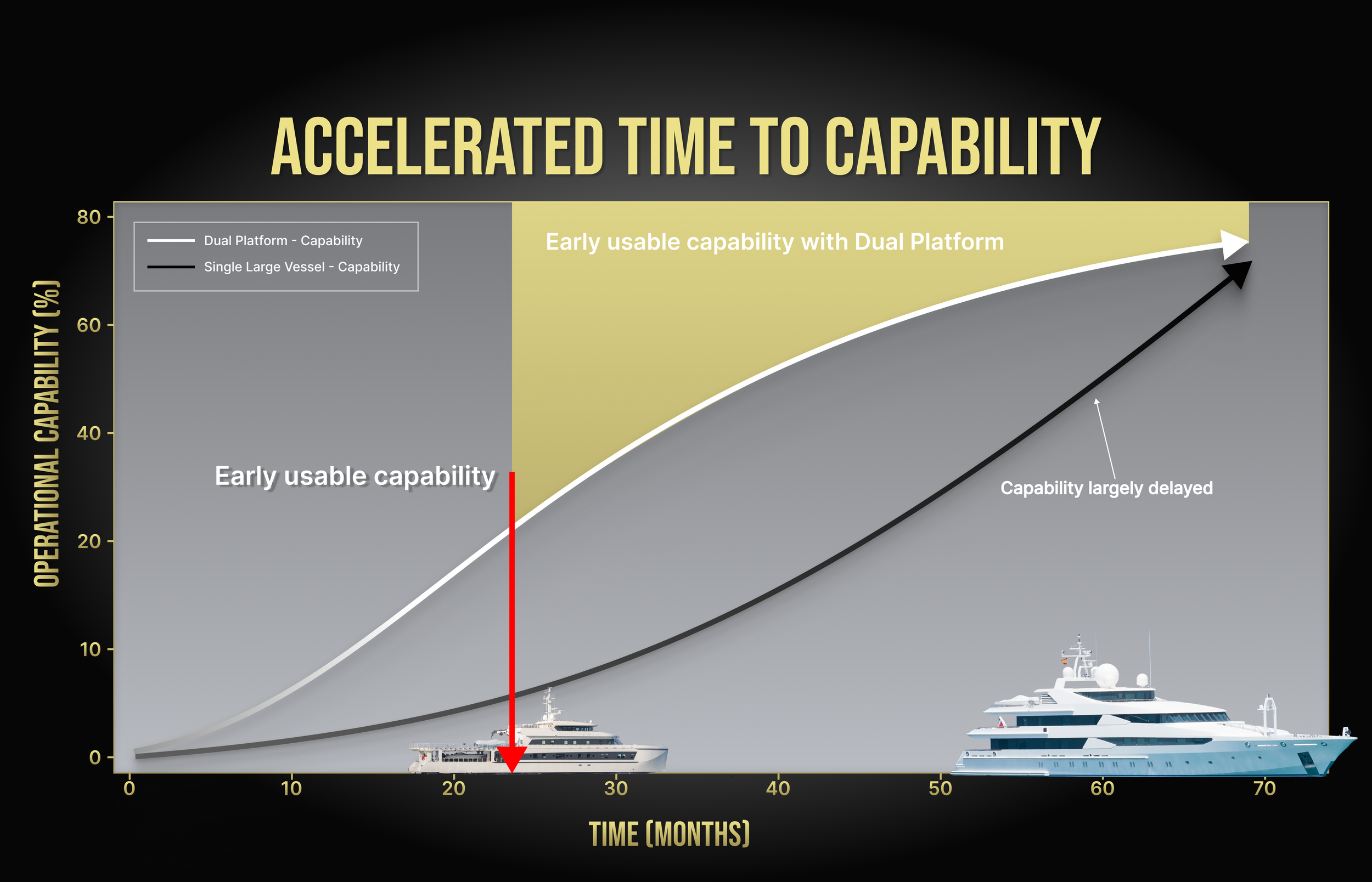 Instead of concentrating everything into a single 90m+ build with an extended and uncertain timeline, the program is split across platforms that can be delivered and deployed sooner. A smaller, highly capable mothership paired with a dedicated support vessel allows critical operational functions to exist independently and be used immediately.