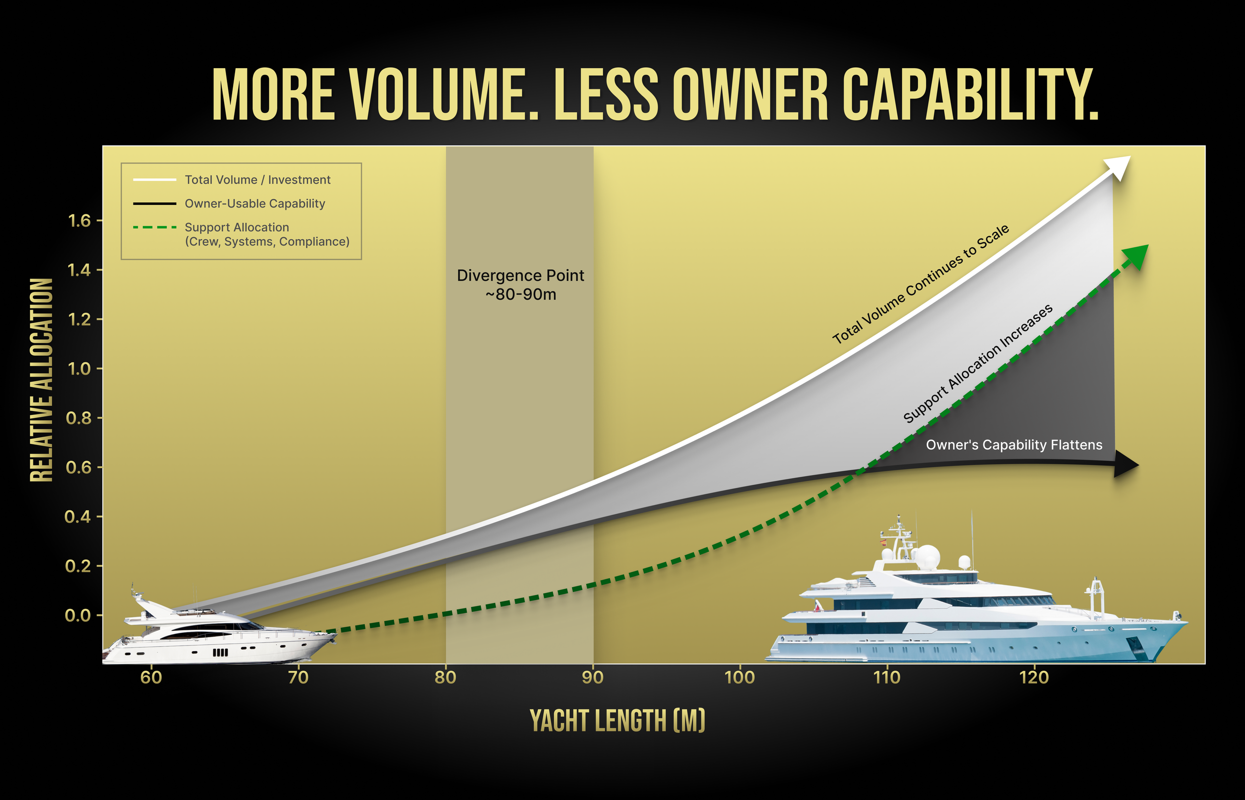 This distinction is subtle, but critical. Owners are increasingly investing in the infrastructure required to sustain scale, while realizing only marginal gains in usable, owner facing capability. When considered together, these factors suggest that large yachts reach a practical ceiling in what a single platform can deliver.